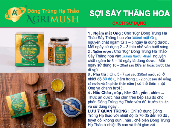 + Ngâm rượu: Cho 10gr Đông Trùng Hạ Thảo Sấy Thăng hoa vào 500ml Rượu 40độ nguyên chất ngâm từ 5 – 10 ngày là dùng được . Mỗi ngày sử dụng 10 – 20ml sau bữa ăn hoặc trước khi đi ngủ.
